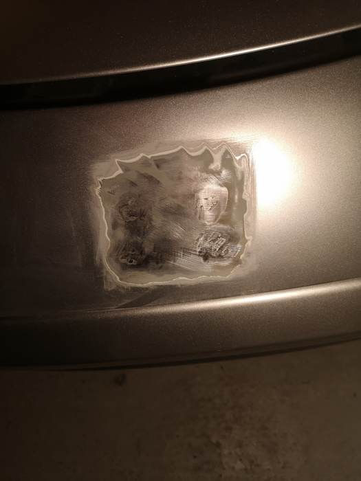 Par prudence j'ai pris un chèche cheveux pour décoller le sticker et le logo,après un coup de polich le cheval cabré (faire defilé la photo)et gravé sur la tôle ,quel gachis et 2 trous pour fixer le logo qui ne provient je suppose pas d'une Barchetta Alors soit je bouche et repeint proprement pour faire un arrière lisse,soit je fait une solution bidonner comme a l'origine par trop envis de cette solution. vos avis?